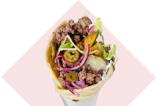 A chopped beef patty with lettuce, sumac infused red onions, sliced gherkins, jalapenos & fries. Includes sourdough flatbread and lashings of cream cheese.
